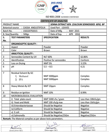 SENNA LEAF EXTRACT 60% (Calcium Sennosides 60%)BP